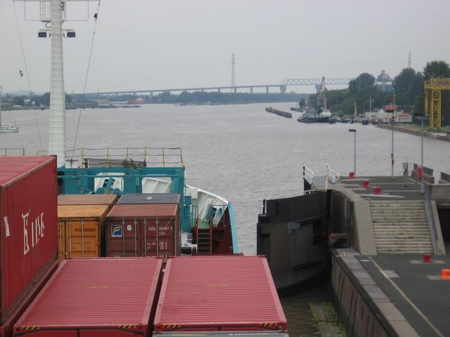 Frachtschiffreise -- Vor uns öffnet sich die Schleuse zum Nord-Ostsee-Kanal